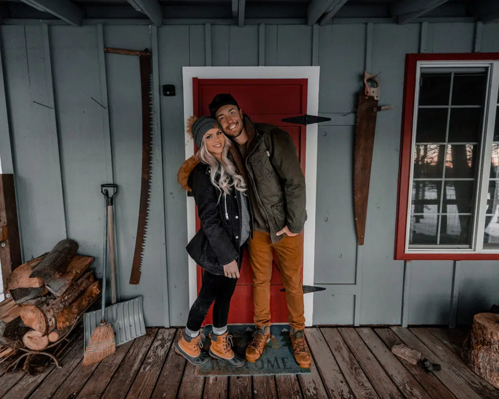 At this point, if you’re arriving for check-in around 4 pm, the tree limbs begin to glow a warm orange tone. Not only were the tree bases covered in soft twinkling snow, but so was the entire surrounding ground of the cabin. As you could assume, we couldn’t wait to get inside.