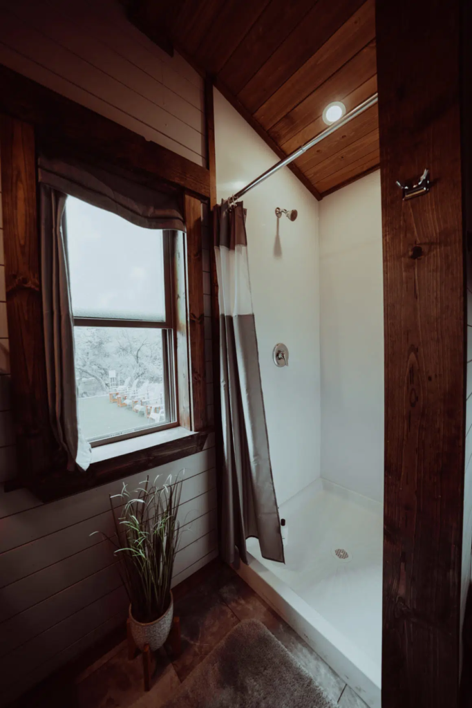 The Wonder tiny house backs up to a wooded area filled with solar lights that help you navigate at night. In addition to the beautiful natural ambiance, there is also a hammock, picnic table and outdoor shower behind the house. There is even a hot tub located in the back corner of the lot.