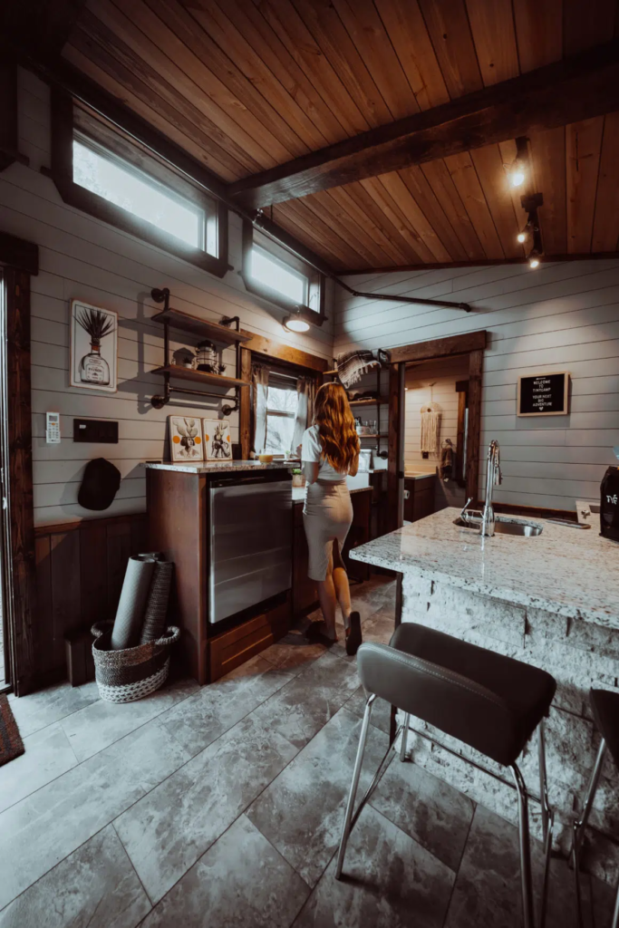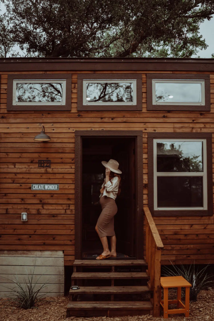 First we checked into our unit, the Wonder tiny house. The layout has all the comforts of home, just packed into a smaller footprint. For example, you’ll find there is a kitchen with a bar top seating area, microwave, cooktop, sink and fridge.